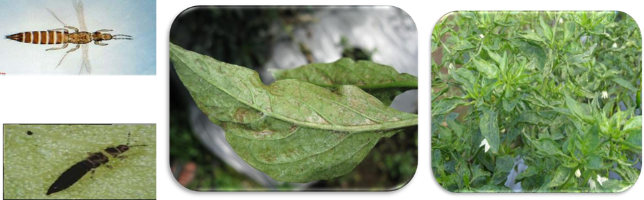 Gejala : Permukaan bawah daun yang terserang berwarna keperak-perakan dan daun mengeriting atau berkerut