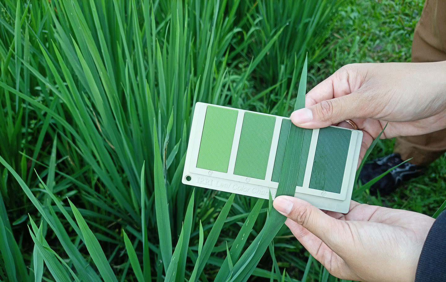 Taruh bagian tengah daun di atas BWD dan bandingkan warnanya. Jika warna daun berada diantara 2 skala, digunakan nilai rata-ratanya, misalnya : 3,5 untuk warna antara 3 dan 4.