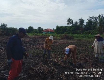 Salah satu upaya petani dalam mempersingkat waktu penanaman padi adalah dengan melakukan penanaman secara bersama atau gotong royong. Bagi petani desa Meranti Bunting, padi merupakan tanaman yang sangat jarang di tanam, sehingga dalam penanamannya membutuhkan waktu yang sangat lama. Petani yang bergabung dalam Gapoktan Meranti Maju melakukan penanaman secara bergotong royong. Kegiatan ini juga dihadiri oleh PPL Desa Meranti Bunting dan Sekretaris Desa Meranti Bunting, yang juga ikut melakukan penanaman.